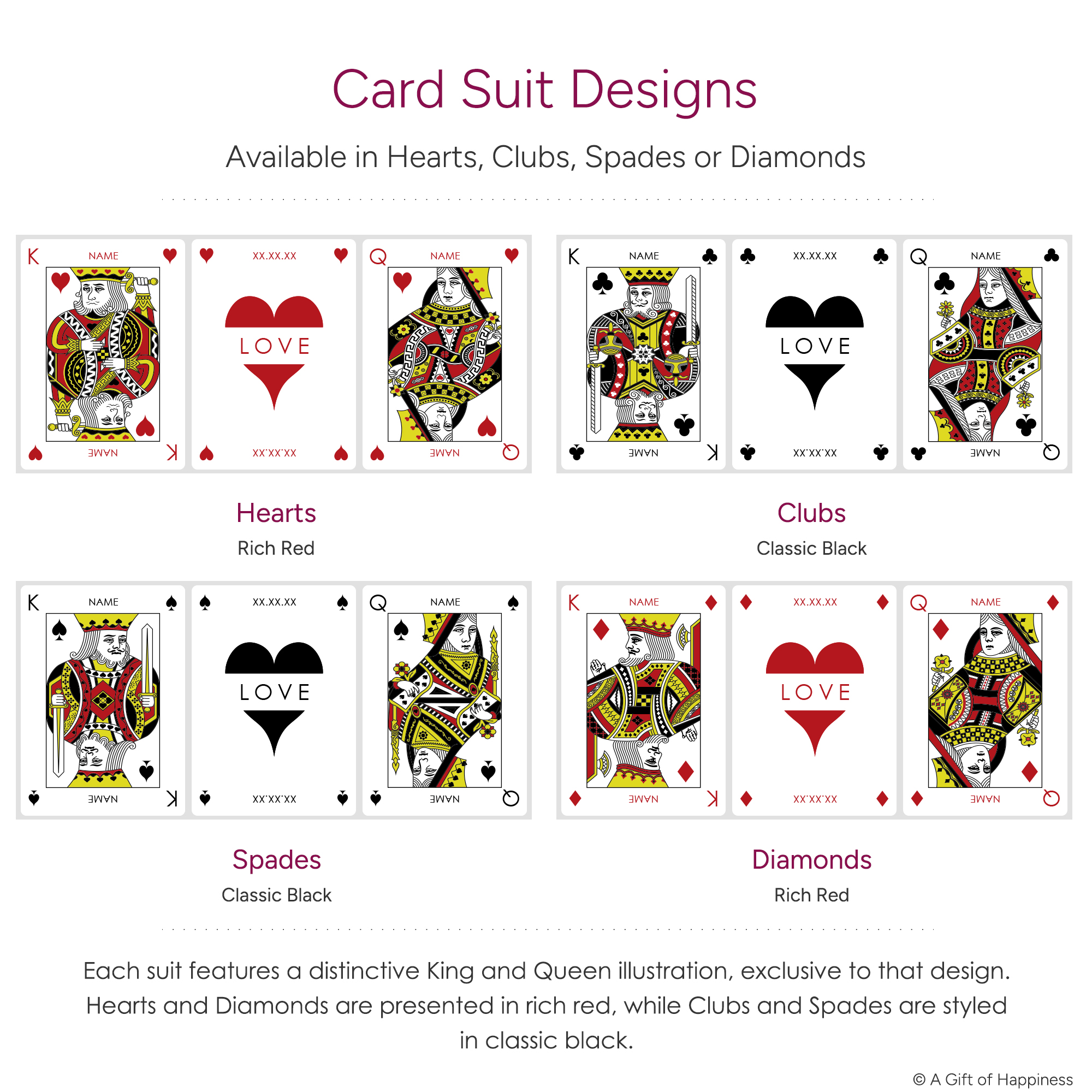 - Distinctive royal illustrations in classic black or rich red, depending on your chosen suit